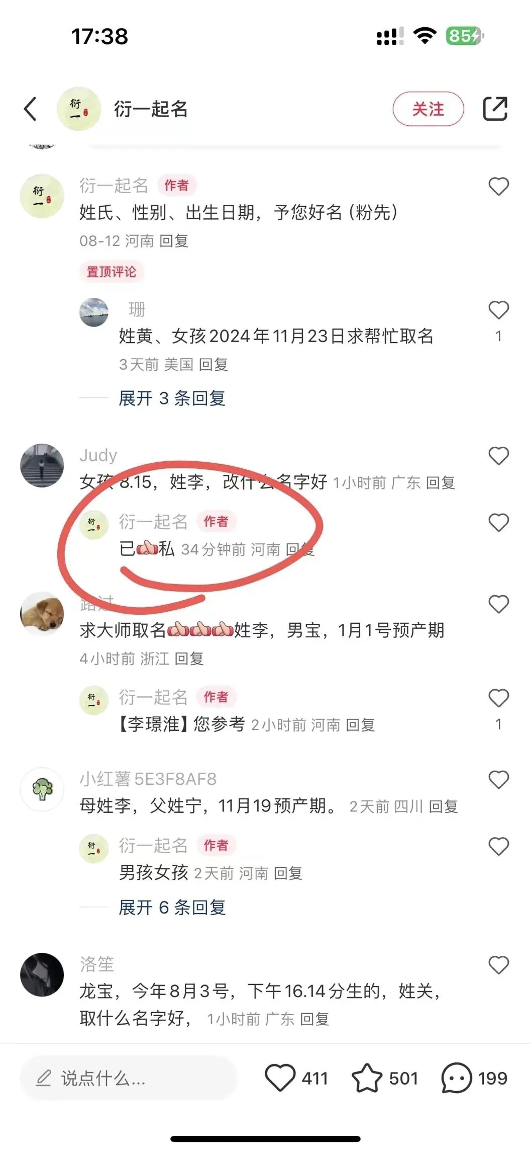 大家可以去小红书上搜索一些关键词,比如:张姓男孩起什么名字比较好、刘姓女孩起什么名字好等等,这个时候,我们会发现大量的人在发布起名贴,帖子底下会有很多人咨询:X姓女孩起什么名比较好呢老师,然后我们会看到老师回复他们“私”、“后台滴滴”等,引导他们进私域。