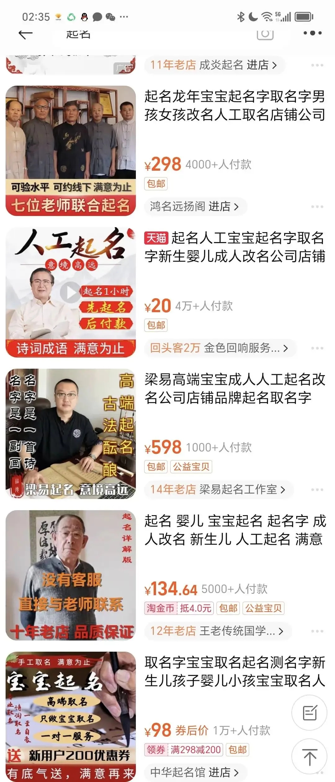 大家有没有发现,淘宝上那些起名的,全部都是这么干的,但人家一个月照样几十万的挣,你还别不信,去淘宝上搜一下“起名”,你就知道这个行业多暴利了,你以为他们都是真人帮你起的名字吗?